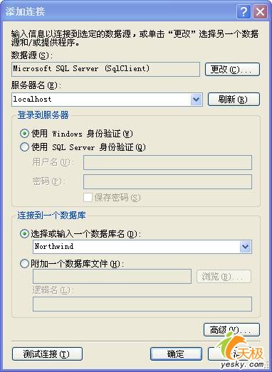 4、出現(xiàn)"添加連接"窗口后,我們可以將數(shù)據(jù)源選擇為"miscrosoft sql server"。服務(wù)器名我們可以設(shè)置為計算機名,也可以用"localhost"替代。我們在此利用"windows 身份驗證"登錄到服務(wù)器上,并選擇"northwind"為即將連接的數(shù)據(jù)庫。單擊"測試連接"按鈕,如果提示成功則表示已經(jīng)可以連接到相應(yīng)的數(shù)據(jù)源上了。