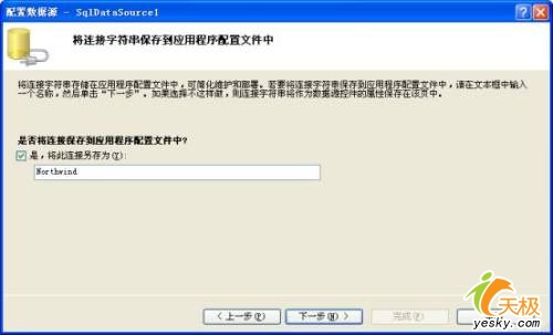 6、在下圖所以示的窗口中,提示是否將連接保存到應(yīng)用程序配置文件中,如果選"是"的話,將會使用asp.net 2.0的新的聲明性表達式語法解析連接字符串,并且將其保存到相應(yīng)的web.config配置文件中。