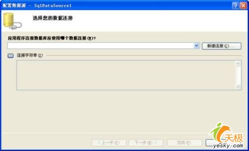 3、出現(xiàn)"配置數(shù)據(jù)源"窗口后,你會發(fā)現(xiàn)在窗口中的"連接字符串"區(qū)域為空,現(xiàn)在我們可以單擊"新建連接"按鈕來生成一個數(shù)據(jù)庫連接字符串。