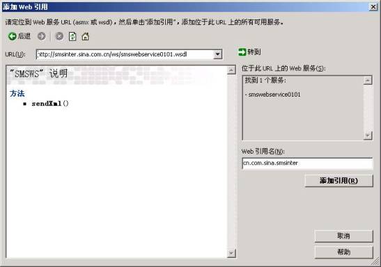 ![]() 圖05:在【短信】項(xiàng)目中添加web引用的界面  |