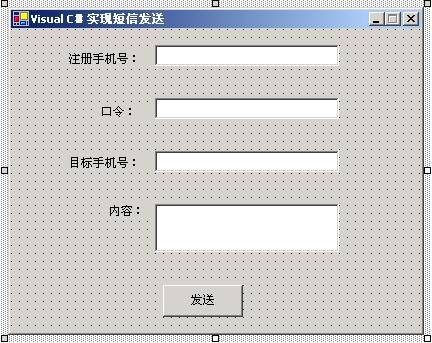 | private void initializecomponent ( )  { this.textbox1 = new system.windows.forms.textbox ( ) ; this.textbox2 = new system.windows.forms.textbox ( ) ; this.textbox3 = new system.windows.forms.textbox ( ) ; this.button1 = new system.windows.forms.button ( ) ; this.label1 = new system.windows.forms.label ( ) ; this.label2 = new system.windows.forms.label ( ) ; this.label3 = new system.windows.forms.label ( ) ; this.label4 = new system.windows.forms.label ( ) ; this.textbox4 = new system.windows.forms.textbox ( ) ; this.suspendlayout ( ) ; this.textbox1.location = new system.drawing.point ( 144 , 16 ) ; this.textbox1.name = "textbox1" ; this.textbox1.size = new system.drawing.size ( 184 , 21 ) ; this.textbox1.tabindex = 0 ; this.textbox1.text = "" ; this.textbox2.location = new system.drawing.point ( 144 , 69 ) ; this.textbox2.name = "textbox2" ; this.textbox2.passwordchar = '*' ; this.textbox2.size = new system.drawing.size ( 184 , 21 ) ; this.textbox2.tabindex = 1 ; this.textbox2.text = "" ; this.textbox3.location = new system.drawing.point ( 144 , 122 ) ; this.textbox3.name = "textbox3" ; this.textbox3.size = new system.drawing.size ( 184 , 21 ) ; this.textbox3.tabindex = 2 ; this.textbox3.text = "" ; this.button1.location = new system.drawing.point ( 152 , 256 ) ; this.button1.name = "button1" ; this.button1.size = new system.drawing.size ( 80 , 32 ) ; this.button1.tabindex = 4 ; this.button1.text = "發(fā)送" ; this.button1.click += new system.eventhandler ( this.button1_click ) ; this.label1.location = new system.drawing.point ( 56 , 24 ) ; this.label1.name = "label1" ; this.label1.size = new system.drawing.size ( 88 , 16 ) ; this.label1.tabindex = 5 ; this.label1.text = "注冊(cè)手機(jī)號(hào):" ; this.label2.location = new system.drawing.point ( 88 , 77 ) ; this.label2.name = "label2" ; this.label2.size = new system.drawing.size ( 72 , 16 ) ; this.label2.tabindex = 6 ; this.label2.text = "口令:" ; this.label3.location = new system.drawing.point ( 56 , 128 ) ; this.label3.name = "label3" ; this.label3.size = new system.drawing.size ( 96 , 16 ) ; this.label3.tabindex = 7 ; this.label3.text = "目標(biāo)手機(jī)號(hào):" ; this.label4.location = new system.drawing.point ( 96 , 176 ) ; this.label4.name = "label4" ; this.label4.size = new system.drawing.size ( 72 , 16 ) ; this.label4.tabindex = 8 ; this.label4.text = "內(nèi)容:" ; this.textbox4.location = new system.drawing.point ( 144 , 175 ) ; this.textbox4.multiline = true ; this.textbox4.name = "textbox4" ; this.textbox4.size = new system.drawing.size ( 184 , 48 ) ; this.textbox4.tabindex = 3 ; this.textbox4.text = "" ; this.autoscalebasesize = new system.drawing.size ( 6 , 14 ) ; this.clientsize = new system.drawing.size ( 410 , 303 ) ; this.controls.add ( this.button1 ) ; this.controls.add ( this.textbox4 ) ; this.controls.add ( this.textbox3 ) ; this.controls.add ( this.textbox2 ) ; this.controls.add ( this.textbox1 ) ; this.controls.add ( this.label4 ) ; this.controls.add ( this.label3 ) ; this.controls.add ( this.label2 ) ; this.controls.add ( this.label1 ) ; this.formborderstyle = system.windows.forms.formborderstyle.fixedsingle ; this.maximizebox = false ; this.name = "form1" ; this.text = "visual c#實(shí)現(xiàn)短信發(fā)送" ; this.resumelayout ( false ) ; }  |