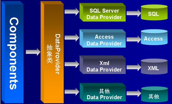 模型中可以看出抽象的dataprovider是與具體的數據庫操作dataprovider分離的,在cs中components與抽象的dataprovider被編譯在一個項目中,而sql server dataprovider則被單獨的編譯出來。好處都可以看到那就是更換不同的dataprovider抽象實現不同的數據庫操作,另外這種松散耦合的方式有利于團隊開放。如何實現這樣的dataprovider方式呢(我這里簡述一些,具體的請關注后續的專題)?