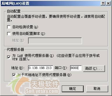 2. 選擇【工具】|【internet選項】,彈出【internet選項】對話框。在此對話框中選擇【連接】頁面,單擊其中的【局域網設置】按鈕。彈出【局域網(lan)設置】對話框。選擇【為lan使用代理服務器(x),(這些設置不會應用于撥號和vpn連接)】多選框。并在其中的【地址】文本框中輸入代理服務器的ip地址,由于測試的代理服務器的ip地址為"10.138.198.213",所有也輸入此ip地址,在【端口】文本框中輸入"8000"。具體如圖03所示: