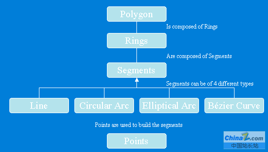 polygon是一系列rings組成的集合,可以擁有m、z和id屬性值。每一個ring由一個或多個segment組成,polygon或ring對象的ipointcollection接口包含了所有節點的復制,igeometrycollection接口可以獲取polygon的rings, isegmentcollection接口可以獲取polygon的segments。