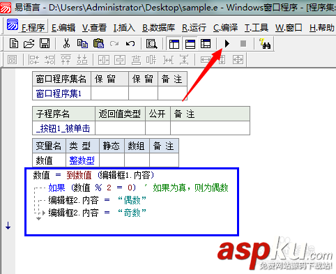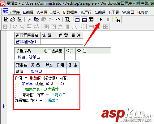 在“程序集”窗口中,輸入如圖所示的“如果”代碼,并點擊“運行”按鈕。