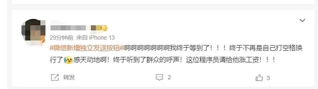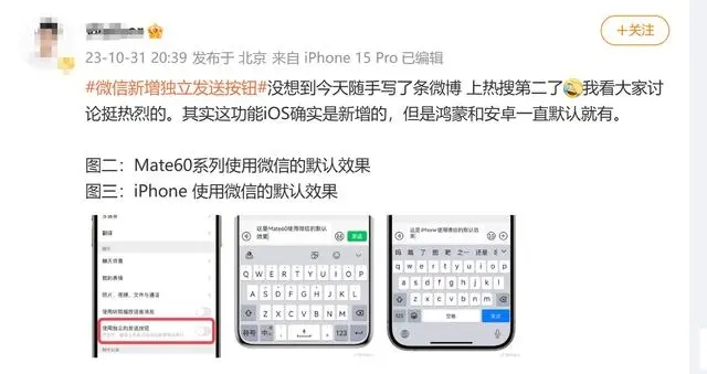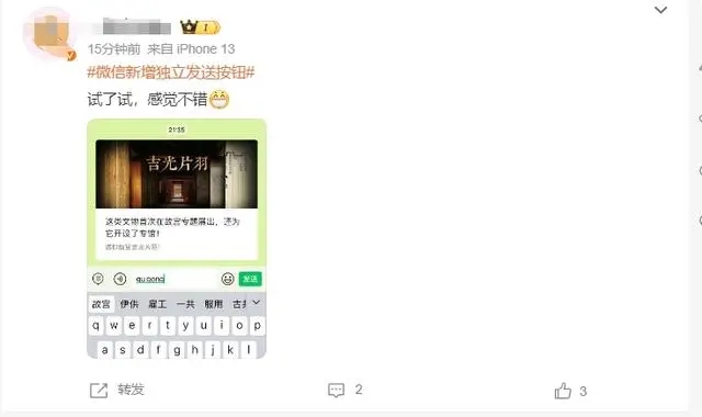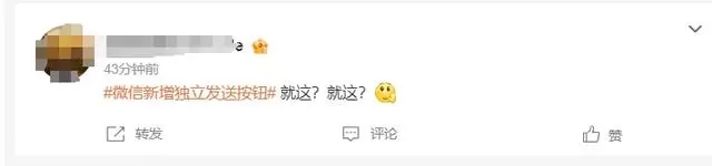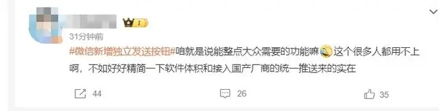 今日,“微信新增獨(dú)立發(fā)送按鈕”沖上熱搜。