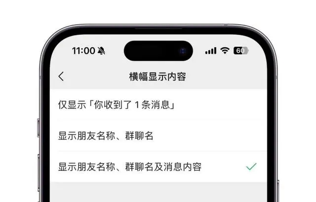 有3種內(nèi)容顯示形式,分別為:僅顯示你收到1條消息,顯示朋友名稱、群聊名,顯示朋友名稱、群聊名及消息內(nèi)容。