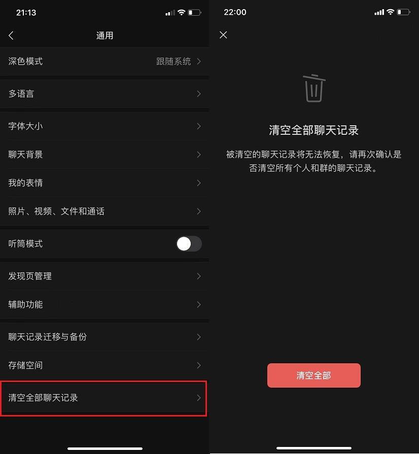 iOS微信8.0.27正式版中,點擊“設置”-“通用”,原來底部的“清空聊天記錄”更改為“清空全部聊天記錄”,點擊按鈕后會出現提示,告知用戶清空的記錄無法恢復需再次確認,用戶可自行選擇是否清空全部。