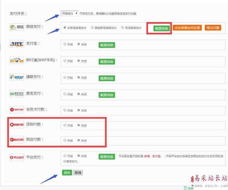 2.配置支付接口。點擊左側微信商城---在線支付設置。選擇什么支付方式就填寫對應的支付配置,【需要公眾平臺開通了微信支付】。然后下面位置貨到付款和到店付款選擇開啟或者關閉狀態。