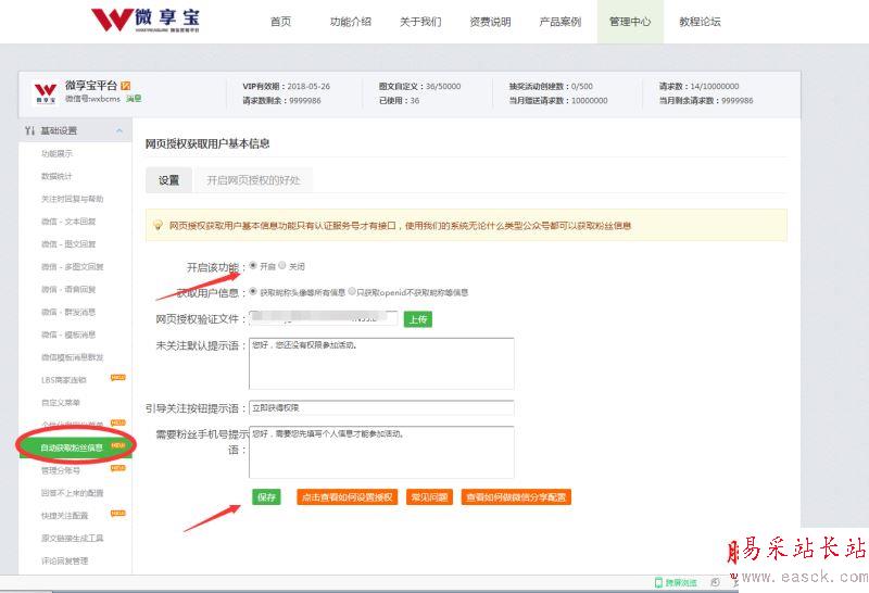 1.準備工作。需要用到微享寶平臺,點擊右上角注冊一個帳號,然后綁定公眾號,綁定方式有API和掃碼授權兩種,二選一操作。然后點擊功能管理進到游戲后臺,點擊左側自動獲取粉絲信息,選擇獲取頭像昵稱等信息,保存