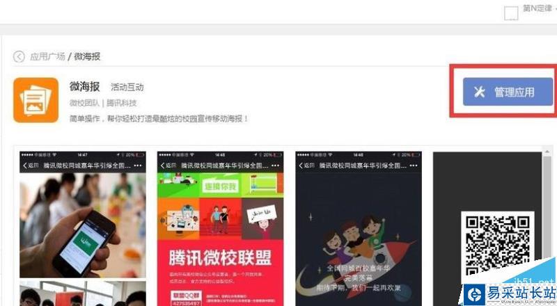 2、找到并點擊進入“應 用廣場”,在“活動互動”里進入“微海報”應 用頁面。如下圖: