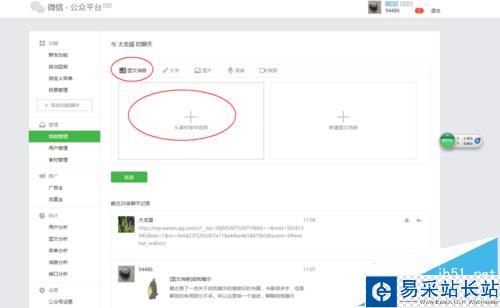 2、然后進入你的公眾號,點擊消息管理。找到你自己,然后點擊發(fā)送消息。選擇圖文素材,選擇你要知道鏈接的圖文。