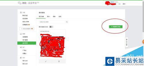 3、進入素材管理欄后,找到新建圖文消息功能,點擊進入下一個界面,新建編輯文章功能。