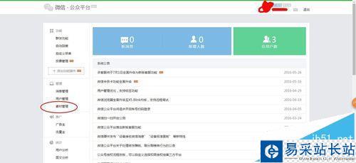 2、登入賬號到微信公眾號后臺,然后查看左邊的菜單欄,找到素材管理欄,點擊進入下一步。