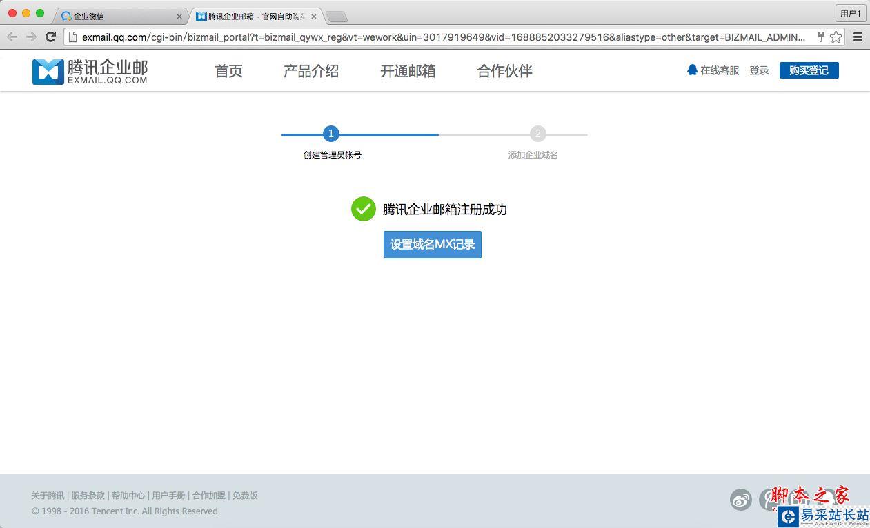 a、管理員創建成功后,騰訊企業郵箱已經注冊成功(限額200人的免費版)。任何時候都可以繼續下方的步驟,無需重新注冊;