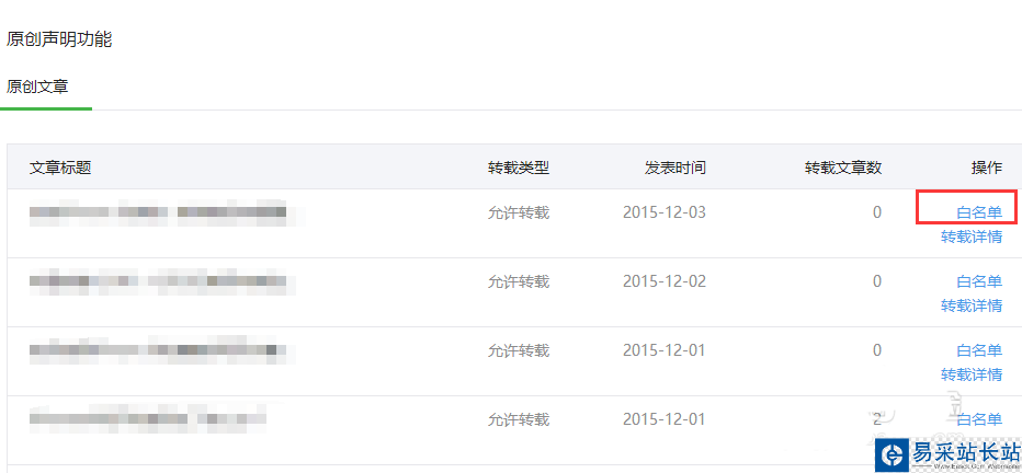 3、這時,頁面右側將顯示出所有已發送的圖文消息,如果某篇文章想授權給某些公眾號轉發,可以在其文章標題右側,點擊白名單