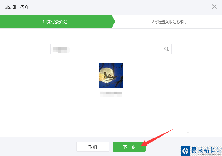 6、這時,在搜索出來的結果當中,核實一下是否想要授權的公眾號,若是,直接點擊下方的下一步即可;若否,請核實清楚再進行授權