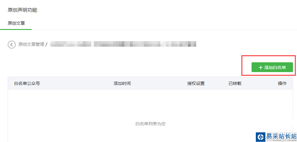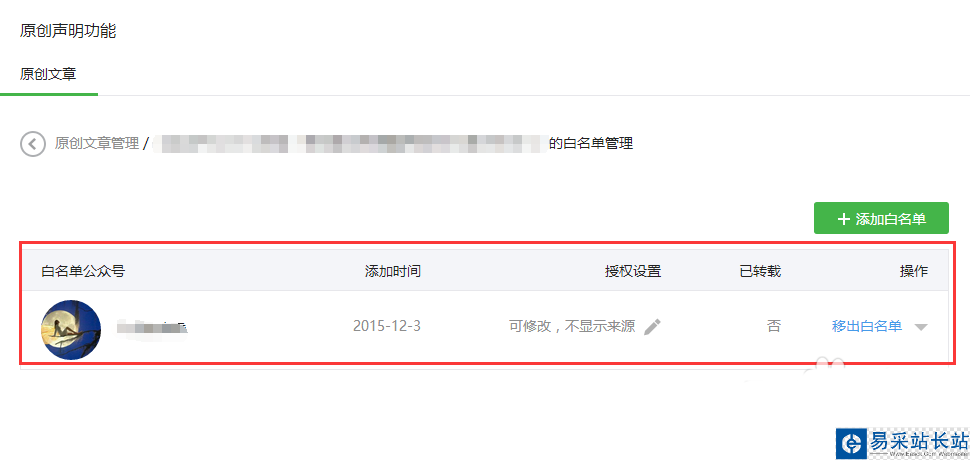 8、這時,我們返回到原來的頁面,可以看到,該授權的文章白名單中就有剛剛設置的公眾號信息了,不過要注意的是,授權僅僅對該文章有效,其他文章無效,若想對其他文章也生效,那么必須按照同樣的方法進行一一授權