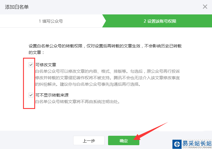 7、進入授權公眾號的權限設置頁面,可以看到有兩種方式,一是授權的公眾號可以修改該授權文章的內容、格式、排版等等,二是授權的公眾號在轉載該原創文章時,文末將不會再顯示轉自某某公眾號;根據情況進行相應的權限授權設置即可,然后點擊確定