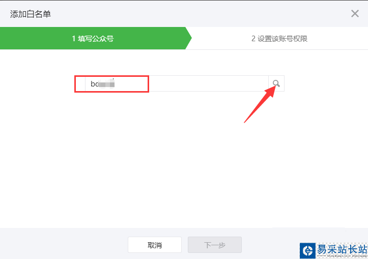 5、在打開的添加白名單頁面當中,搜索框輸入想要授權的公眾號微信號或者原始ID,輸入完畢之后點擊右側的搜索圖標