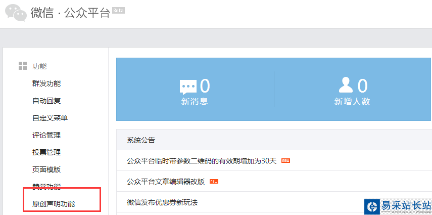 2、進入個人微信公眾平臺首頁,在頁面的左側欄目中選擇原創聲明功能