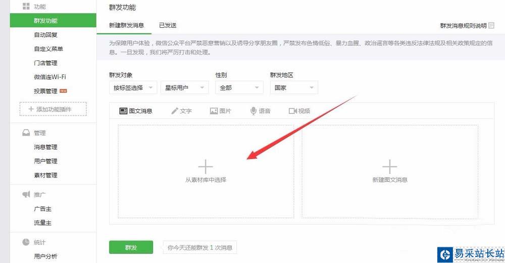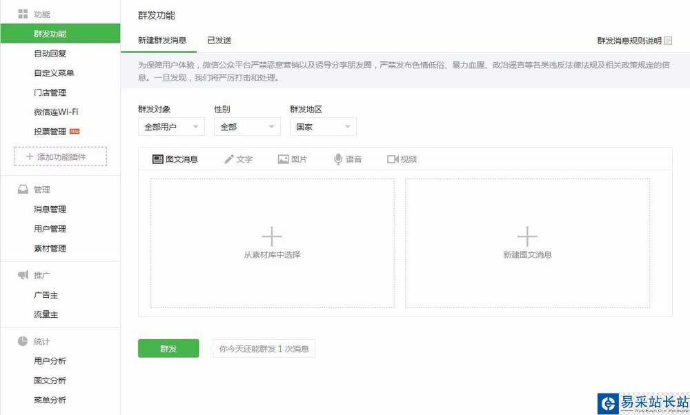 4、點擊【群發(fā)功能】后,進入到群發(fā)功能頁面,默認進入的是【新建群發(fā)消息】窗口。