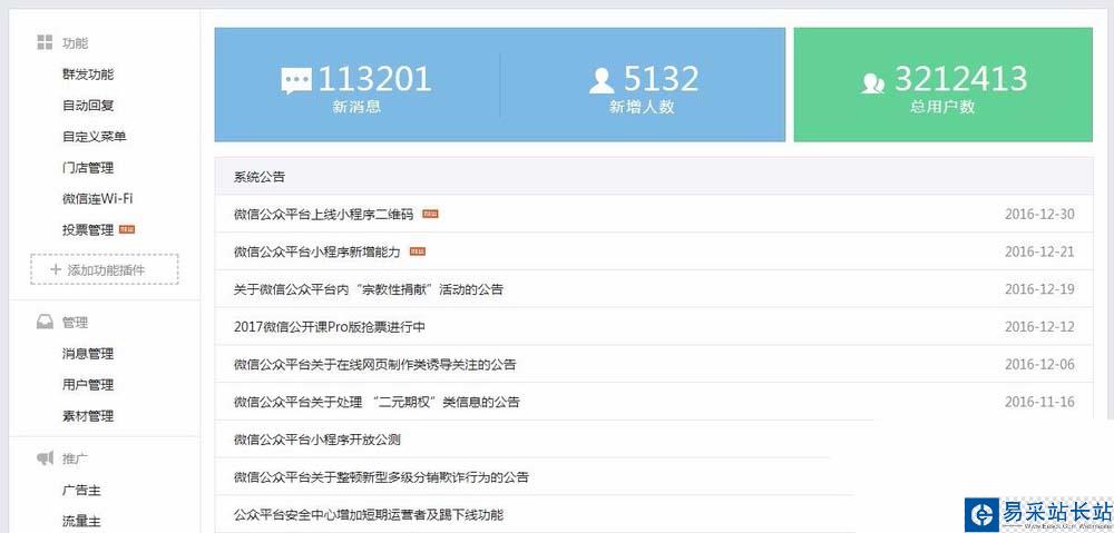 3、登陸微信公眾號后默認進入的是首頁,這里可以看到微信公眾號的基本情況,在左側【功能】下選擇【群發(fā)功能】。
