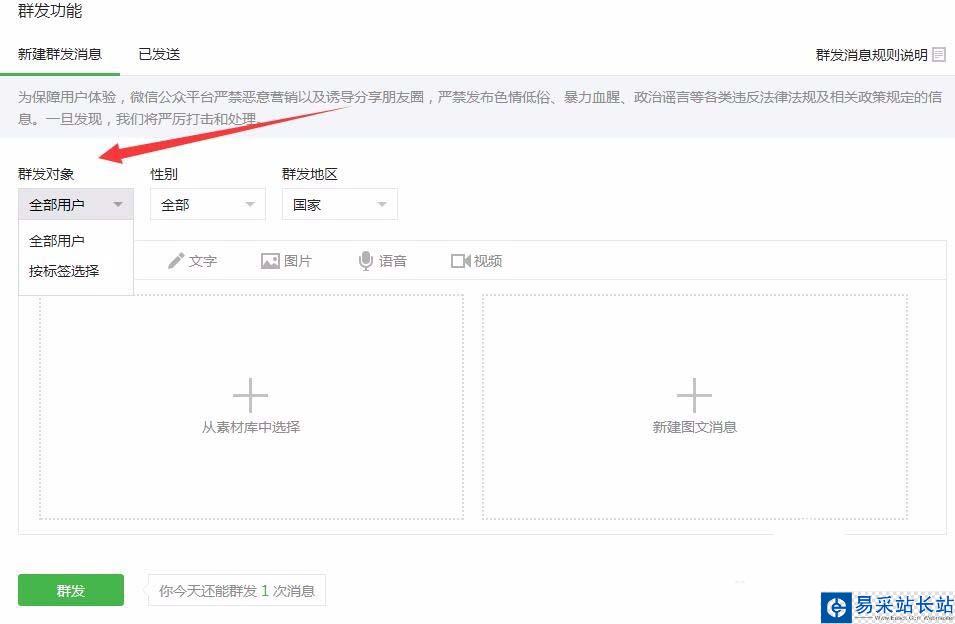 重要的事情提前說:微信公眾號訂閱號目前是每日只能推送一次,即選擇了標簽用戶推送之后不能再對為選擇的標簽用戶推送,目前是一天只能夠推送一次消息。那么微信公眾號如何按標簽選擇推送對象?