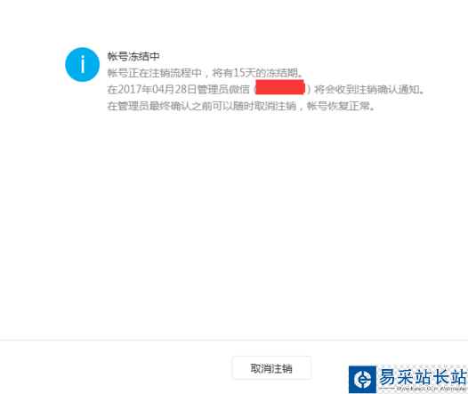 6、管理員確認(rèn)注銷。系統(tǒng)會(huì)通過公眾號(hào)助手發(fā)送確認(rèn)注銷消息給管理員,管理員需要在兩天內(nèi)進(jìn)行確認(rèn),如果兩天內(nèi)未確認(rèn)則注銷取消。