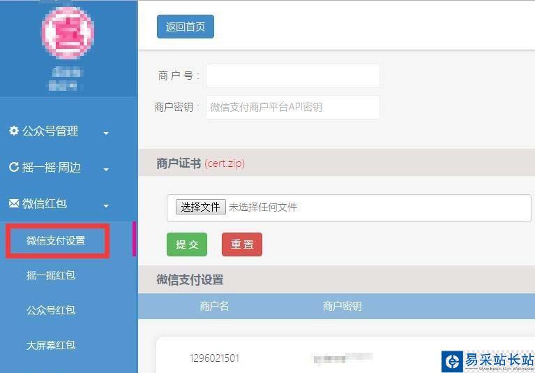 6、選擇功能管理→微信紅包→微信支付設(shè)置。把準(zhǔn)備好的三項(xiàng)資料提交。