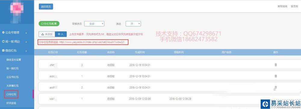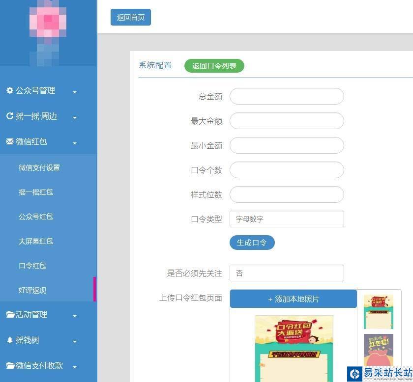 8、點(diǎn)擊口令配置可以進(jìn)入口令紅包的配置頁(yè)面。這里可以選擇口令的樣式,位數(shù),口令紅包的金額范圍等等,也可以自己定義口令,格式如下,前面口令,后面金額。
