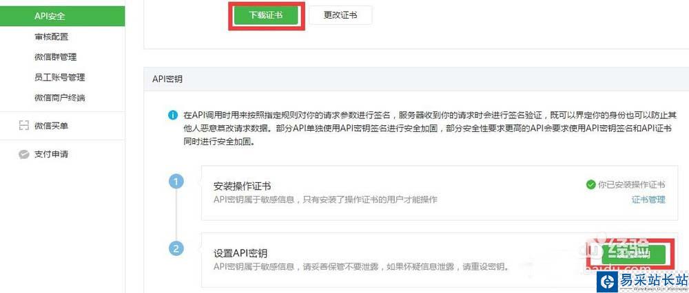 3、API證書(微信支付商戶平臺(tái) - 賬戶中心 - 賬戶設(shè)置 - API安全 - API證書(下載zip壓縮包格式即可,無(wú)須解壓))。API密鑰(微信支付商戶平臺(tái) - 賬戶中心 - 賬戶設(shè)置 - API安全 - API密鑰 - 設(shè)置密鑰(密鑰為32位,需要自行重新設(shè)置,記錄并保存好,實(shí)在沒記住也可以更改))