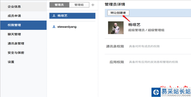 1、登錄管理后臺,點擊【我的企業(yè)】->【權(quán)限管理】->【選擇創(chuàng)建者】;