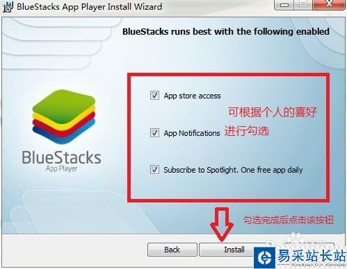 進入下一步之后,出現幾個選項,從上到下分別為 “訪問軟件商店” ,“應用程序通知” 和“訂閱Spotlight,每日免費應用”的意思,可根據個人喜好安裝,不喜歡的則去掉勾選。完成后點擊 "Install" 按鈕進入下一步。