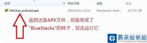 "BlueStacks" 安裝之后,我們去微信官網或者其他途徑下載最新版本的微信APK文件,下載后你會發現,該APK文件已經變成了"BlueStacks"的圖標,雙擊運行它。