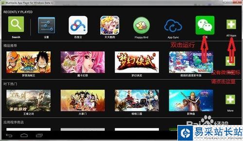 返回"BlueStacks",在界面找到微信,雙擊運行。沒有找到的話,請點擊“All APP”按鈕可以找到