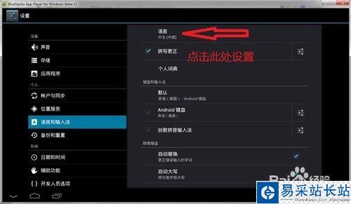 如果發現默認語言是英文或其它您所不熟悉的語言,不用擔心,系統內置了中文支持,只要點擊“設置”按鈕,找到“語言和和輸入法”選項,找到中文就可以了。"BlueStacks"的版本不同,設置方法也會有所差異,具體可自行百度。