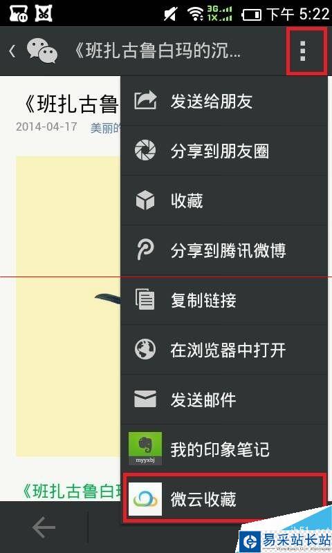 4、需要保存文章時(shí),比如公眾帳號(hào)發(fā)送的文章。點(diǎn)擊右上角“三個(gè)點(diǎn)”,在彈出的列表里選擇“微信收藏”。每成功保存一篇文章或圖片,微云收藏公眾號(hào)都會(huì)發(fā)來提示消息。
