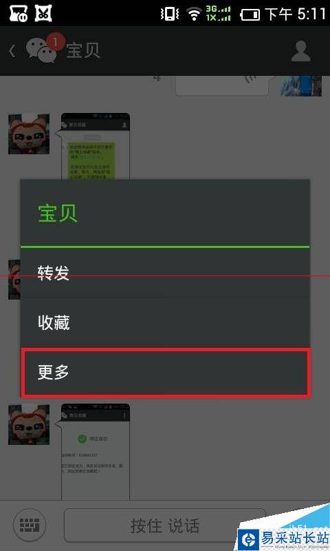 3、需要保存圖片時(shí),長(zhǎng)按需要保存的圖片,會(huì)彈出一個(gè)對(duì)話框,選擇“更多”,如果需要保存多張,可以選擇多張,然后點(diǎn)擊右下角“三個(gè)點(diǎn)”,彈出一個(gè)對(duì)話框,選擇“微云收藏”。