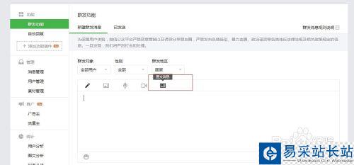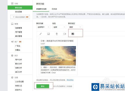 5、點(diǎn)擊公眾平臺(tái)的發(fā)送信息,然后選擇插入剛才編輯的圖文素材,然后點(diǎn)擊發(fā)送。