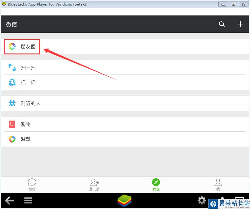 2.微信電腦版登錄后,點發現(操作方法與在手機上一樣),選擇朋友圈
