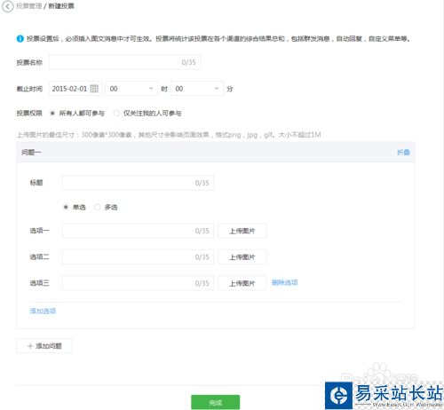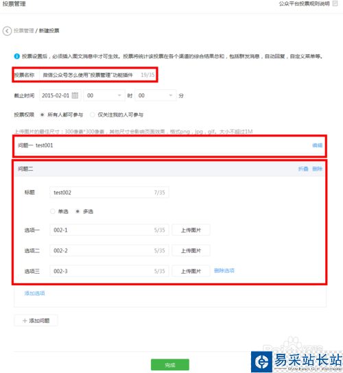 4、在此界面通過填充內容做一個投票設置:第一個選項為帶圖單選,第二個選項為無圖多選,設置成功后點擊頁面底部“完成”按鈕。