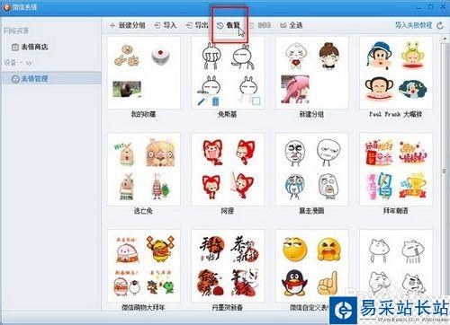 2、在微信表情-表情管理窗口下,單擊“恢復(fù)”按鈕。