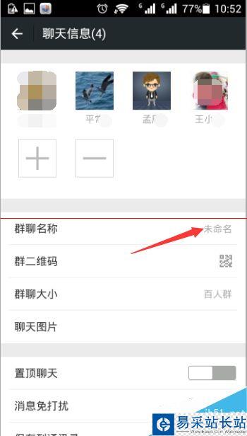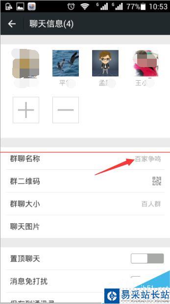3、點擊進入聊天信息以后,該群的成員等基本信息都出現在頁面上,點擊里面的“群聊名稱”菜單,如圖所示。