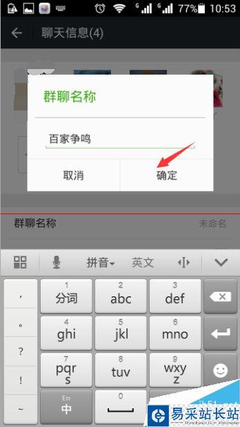 4、點擊進入以后,可以看見有個讓你輸入群聊名稱的對話框,輸入你想要命名的文字,如圖所示。