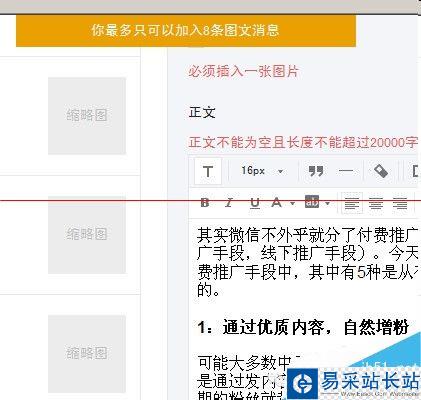 2、而且提示給大家的保存失敗并不是多圖文中您編輯的那篇保存失敗了,而是發(fā)布多圖文必須最少達(dá)到兩條,所以一開始您就必須編輯下一條,但是您沒有編輯,所以這個(gè)保存失敗是指的您下一篇文章保存因?yàn)闆]有編輯保存失敗了。