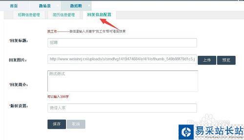 5,設置簡歷信息管理,設置回復信息設置,內容設置好之后,保存。
