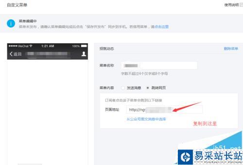 5、我們把剛才建立好的模板的鏈接復(fù)制下來(lái),直接粘貼到自定義菜單即可。(如圖)保存并發(fā)布菜單。