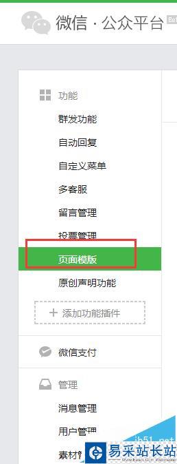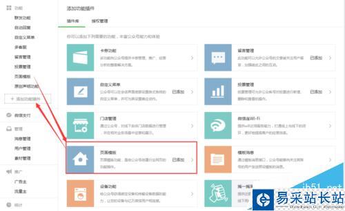 2、進(jìn)入以后 ,點(diǎn)擊右側(cè)功能列表“頁(yè)面模板”,如右側(cè)沒(méi)有則直接點(diǎn)擊下方功能插件添加,在插件功能列表內(nèi)找到“頁(yè)面模板”并添加即可。