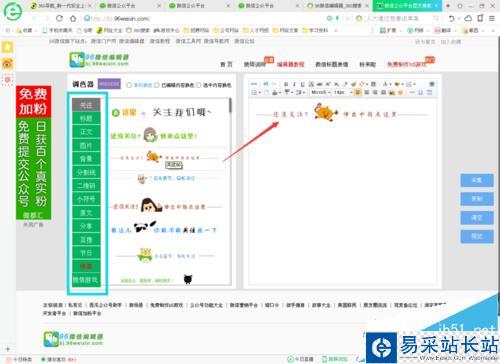3、在頁面的左側,框起來的地方就是我們平時編輯時可能需要的素材,我就不一一介紹了,點擊自己喜歡的樣式,右邊編輯欄就會出現。